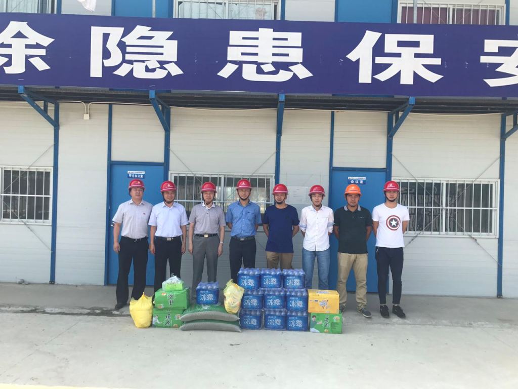 胡書記一行認真聽取了項目部施工現(xiàn)場情況詳細介紹,了解施工進度和下一步施工計劃,仔細詢問了現(xiàn)場防暑降溫工作的落實情況,對在炎熱天氣下工作的員工表示親切的問候,要求項目部合理安排好作息時間,避開高溫時的作業(yè),并把綠豆、白糖、毛巾、礦泉水、風(fēng)油精、人丹、十滴水等防暑降溫用品送到大家手中,叮囑大家一定要做好防暑降溫工作,在施工現(xiàn)場多配備防暑降溫飲品及藥品,采取各種有效措施,確保員工的身體健康和施工安全。