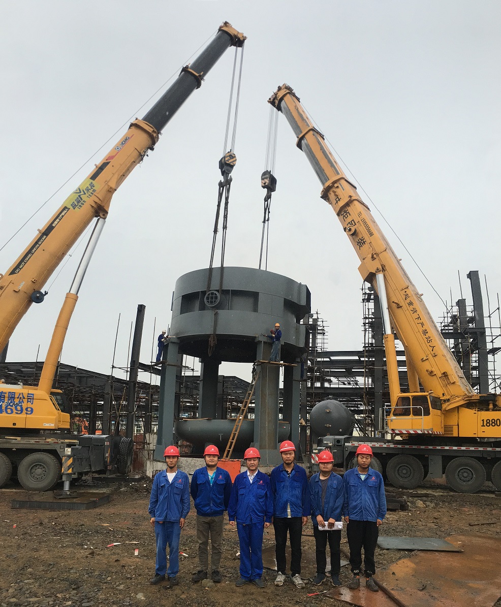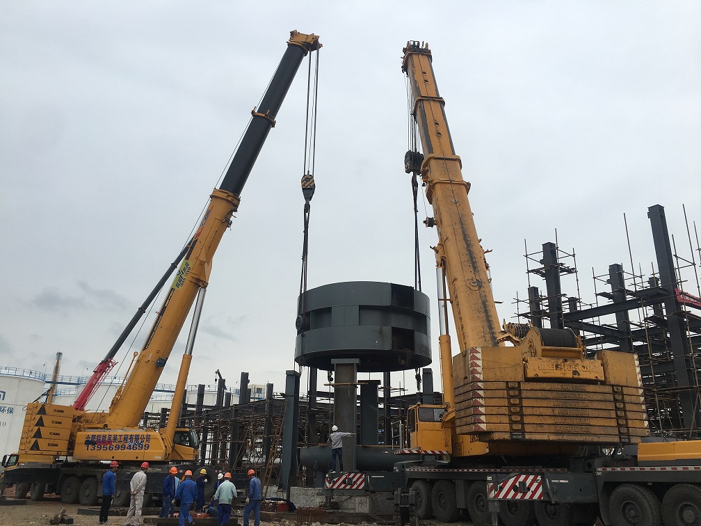 本次吊裝的反應(yīng)器中段部分重達(dá)220噸,分公司領(lǐng)導(dǎo)高度重視,吊裝前期,邀請公司總工吳繼成、總工辦主任牛守義和安全部王岳濤經(jīng)理親臨項目部參與設(shè)備吊裝的專題方案討論定稿工作。當(dāng)日上午,吊裝現(xiàn)場準(zhǔn)備工作緊張卻又有條不紊的進(jìn)行,項目經(jīng)理李子鳳向全體“參戰(zhàn)”員工進(jìn)行了安全交底,工作人員對兩臺分別為500T、350T吊車的站位及性能再次確認(rèn),現(xiàn)場機具、人員均按既定方案實施。分公司經(jīng)理史崇松、業(yè)主單位負(fù)責(zé)人、監(jiān)理全程在現(xiàn)場“督戰(zhàn)”,全體工作人員經(jīng)過四個小時的奮戰(zhàn),吊裝作業(yè)圓滿結(jié)束。